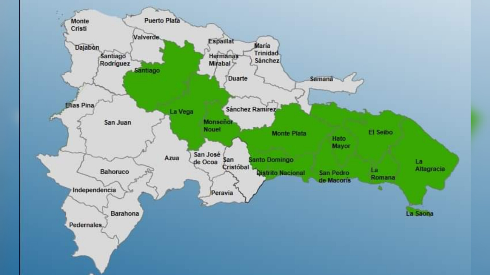 Las provincias bajo alerta verde son: Santiago, Monseñor Nouel, San Pedro de Macorís, La Romana, La Altagracia, La Vega, Hato Mayor, El Seibo, Monte Plata, Santo Domingo y el Distrito Nacional.