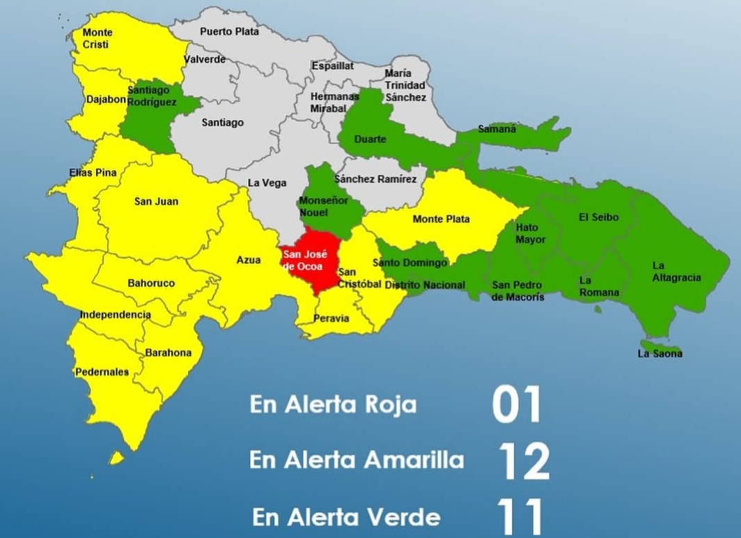 Mientras que en alerta verde están: Monseñor Nouel, Samaná, San Pedro de Macorís, Santo Domingo, Duarte, La Romana, Hato Mayor, La Altagracia, El Seibo, Santiago Rodríguez y el Distrito Nacional.
