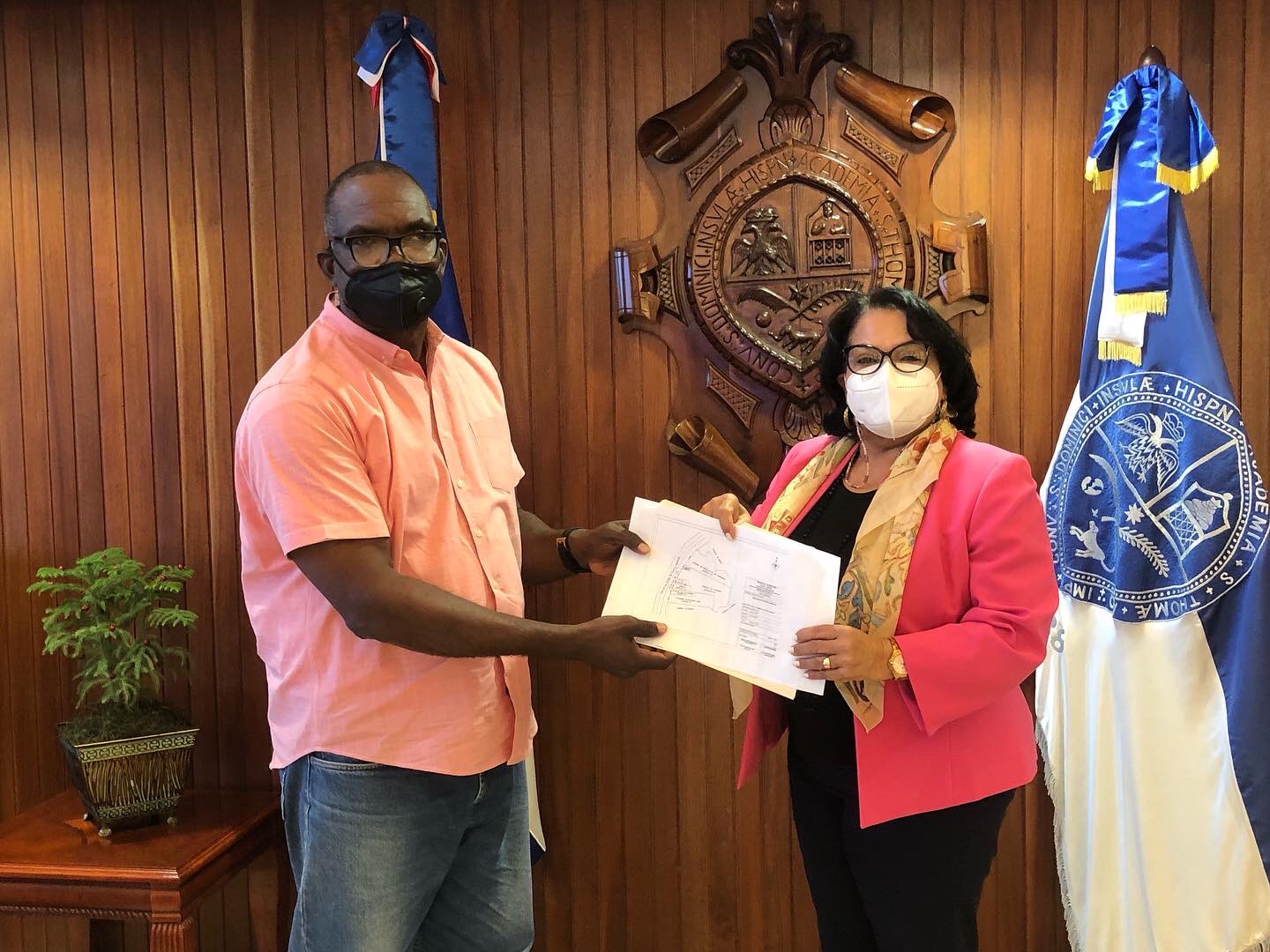 La rectora doctora Emma Polanco, recibió en su despacho a Cristian Encarnación alcalde del municipio Los Alcarrizos, quien aprovechó el encuentro para entregarle los títulos de los terrenos donde será construida la extensión de la UASD, en esa demarcación.
